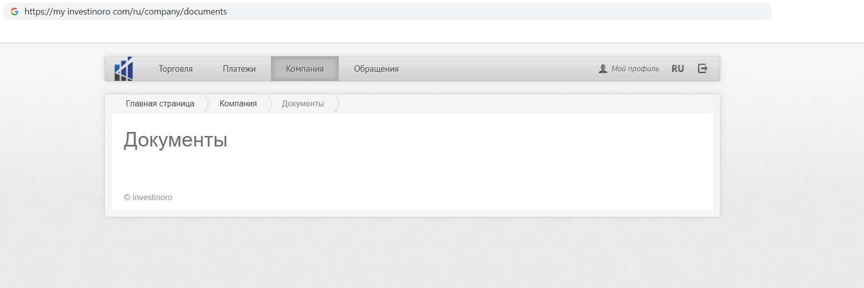 На своём сайте компания лохотронщиков investinoro com не предоставила никакой документации. Даже в разделе с документами фирмы - пусто. Фирма не обладает никакой юридической силой.