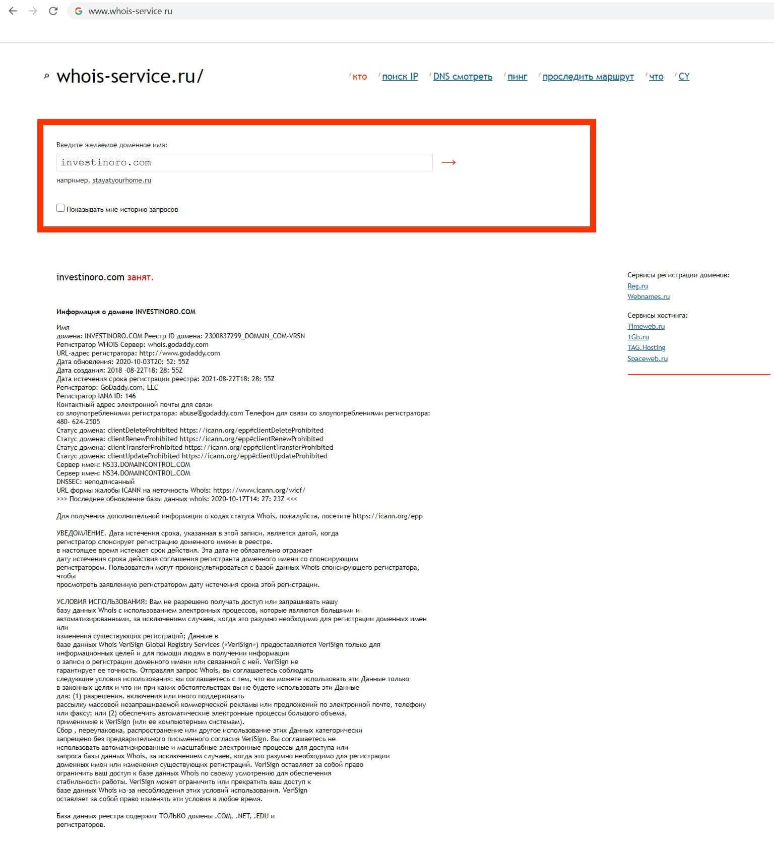 Мы решили узнать информацию о том, кто владеет доменом компании кидал Инвестиноро? Для этого проверили сайт жуликов через интернет ресурс whois-service ru. Оказалось, что разводилы скрывают владельца домена.