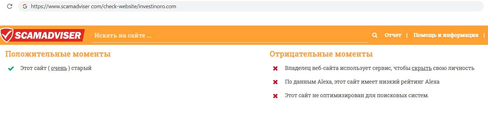 Мы проверили сайт финансовых аферистов Investinoro через интернет ресурс scamadviser com. Оказалось, что владелец компании скрывает свою личность с помощью дополнительного сервиса, так же сайт не оптимизирован к поисковым системам.