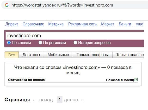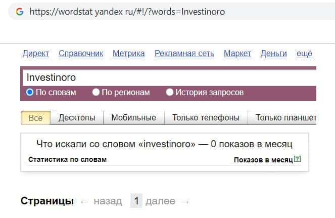 Мы проверили количество запросов компании мошенников Investinoro в Яндексе по названию фирмы, а именно "Investinoro". Но никто из пользователей не совершал данный запрос.