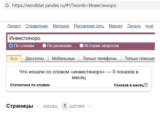 Так же мы проверили количество запросов лохотрона Investinoro по русскоязычному названию конторы, а именно "Инвестиноро". Но и этот запрос никто из пользователей не выполнял.