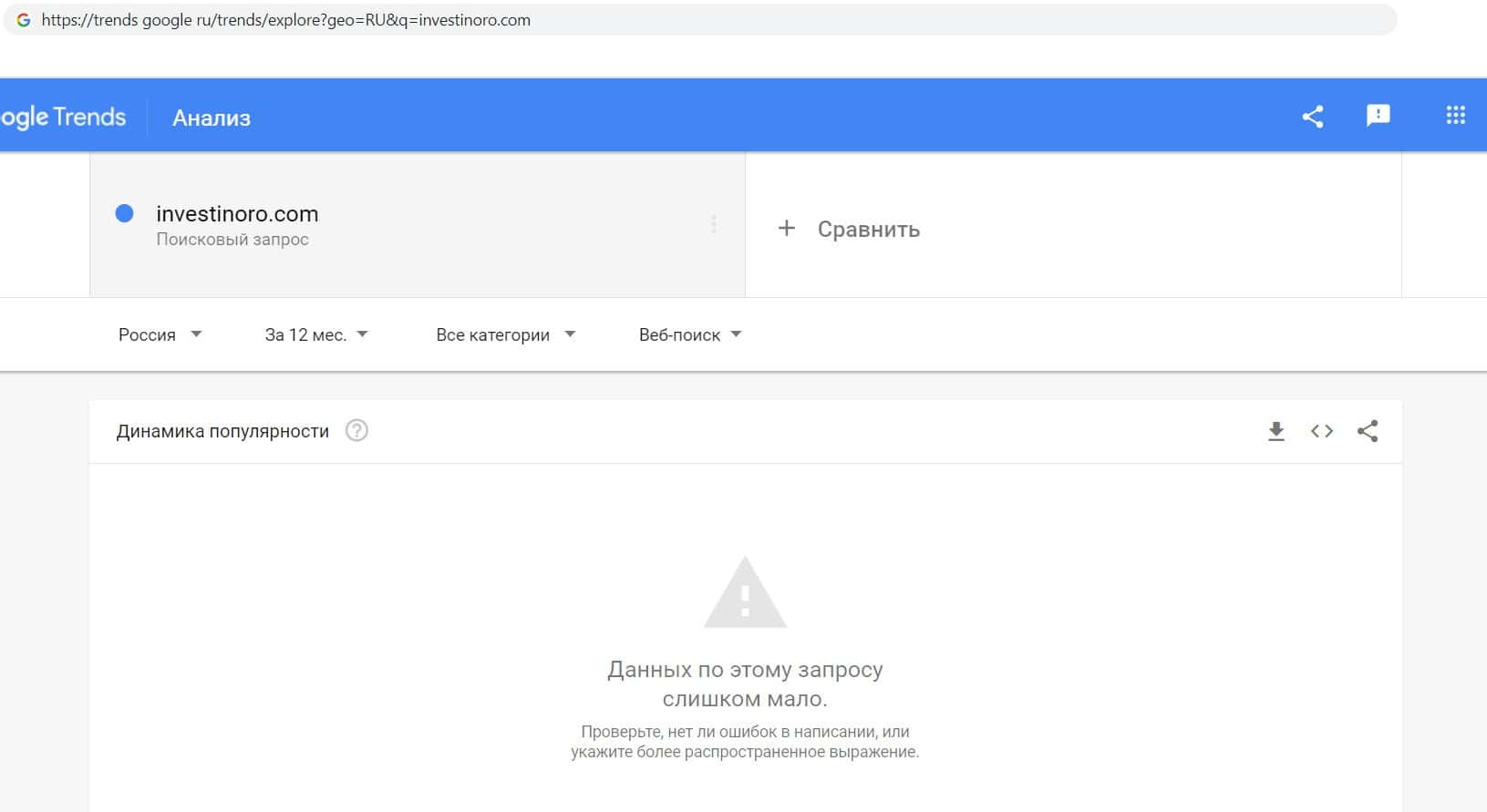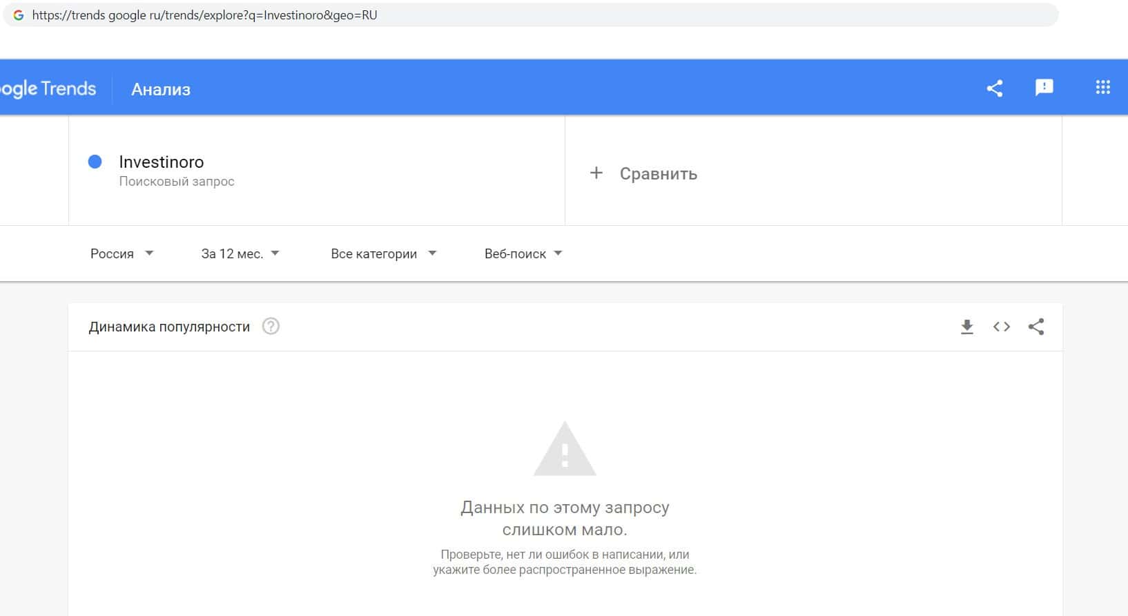 Мы решили проверить количество запросов компании махинаторов Investinoro в Google по названию фирмы, а именно "Investinoro". Но пользователи не выполняли данный запрос целый год.