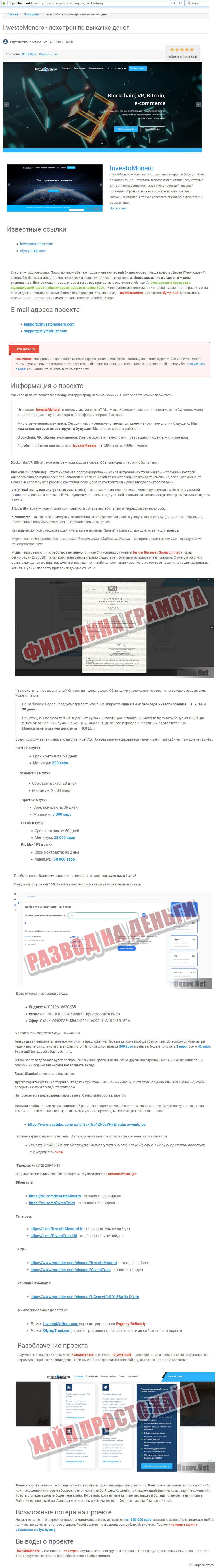 Пользователь сайта baxov net некая Masha оставила свое мнение о мошенниках из Инвесто Монеро. В нем она приводит доказательства того, что данная компания является обычной финансовой пирамидой или HYIP-проектом. Лучше с мошенниками не связываться, а обходить их стороной.