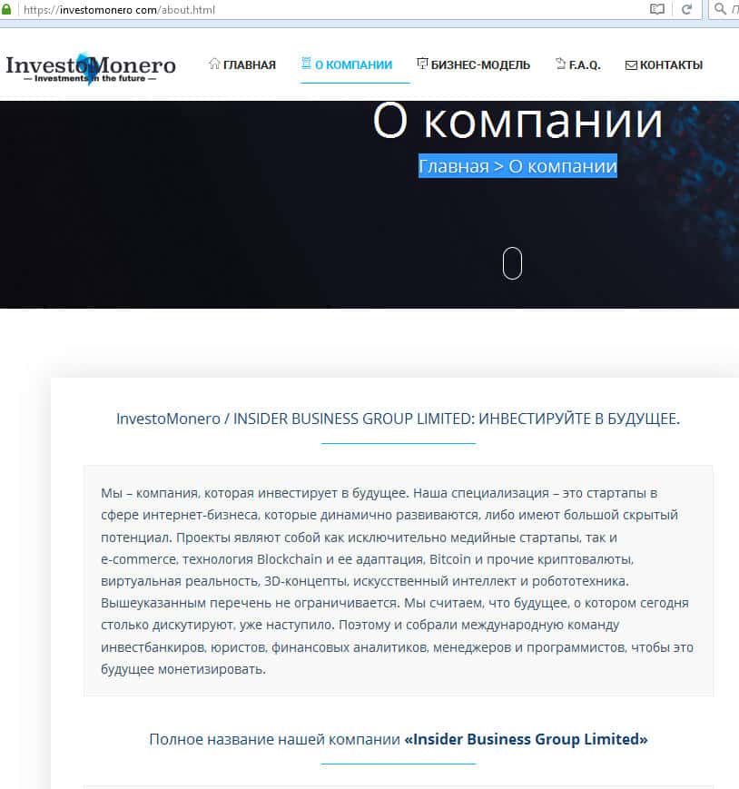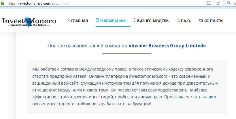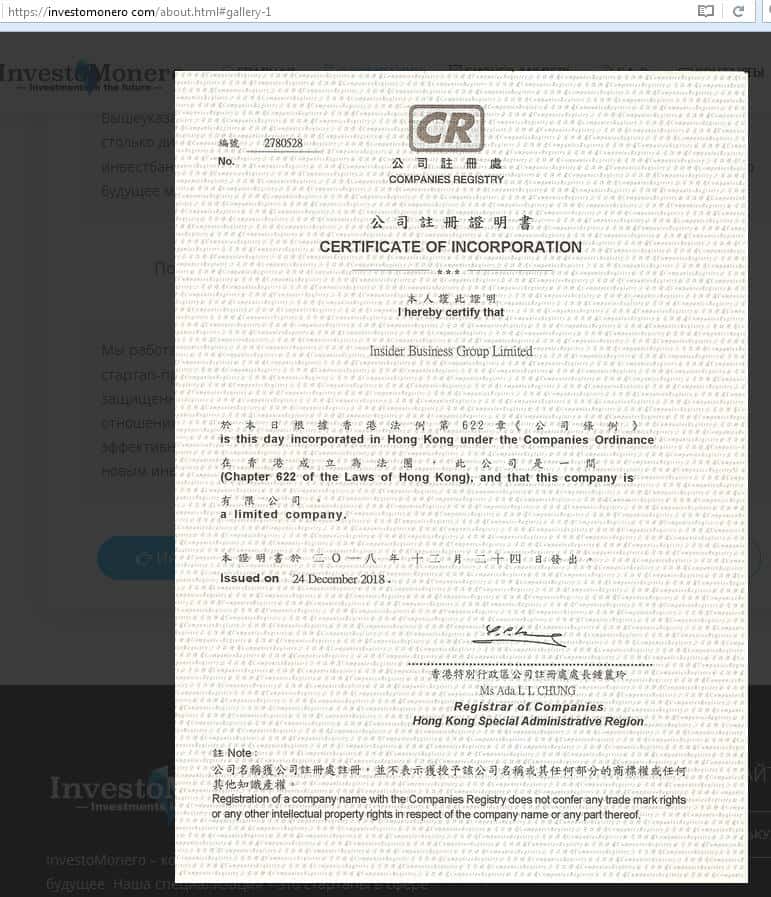 Компания Инвесто Монеро, если верить сайту, имеет полное название Insider Business Group Limited, а также именно на это имя организация внесена в реестр компаний Гонконга в 2018 году. Как это поможет снизить риски вложений в компанию ИнвестоМонеро, лично нам не понятно.