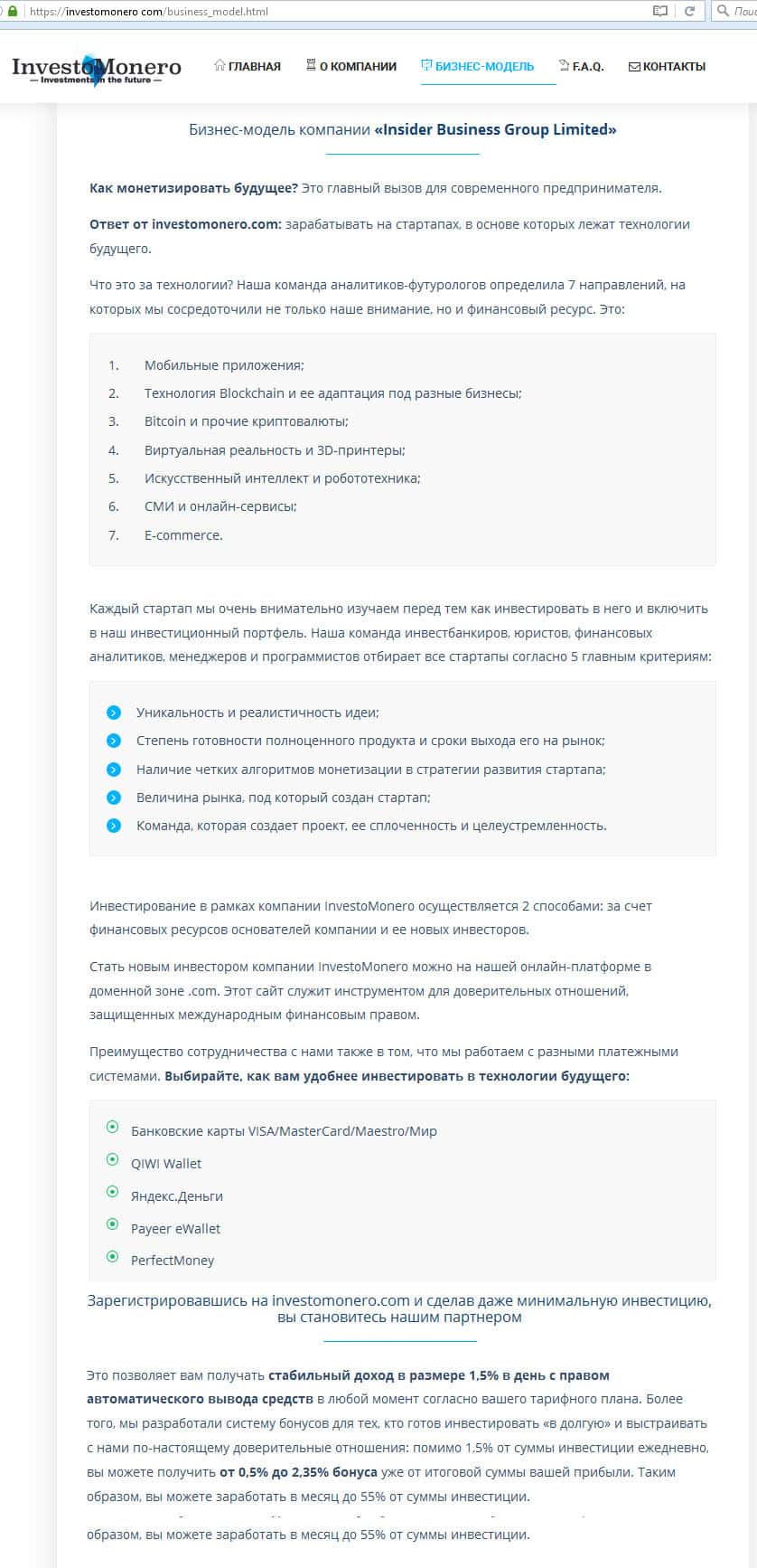 - Бизнес-модель, предложенная на сайте InvestoMonero com