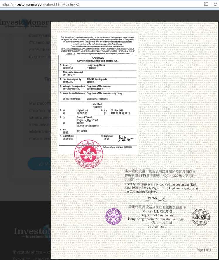 Компания, организовавшая проект ИнвестоМонеро, располагается в Гонконге. Не имеет лицензию, а значит и права предоставлять свои услуги на территории Российской Федерации. В связи с этим мы настоятельно рекомендуем не связаться с мошеннической конторой InvestoMonero.