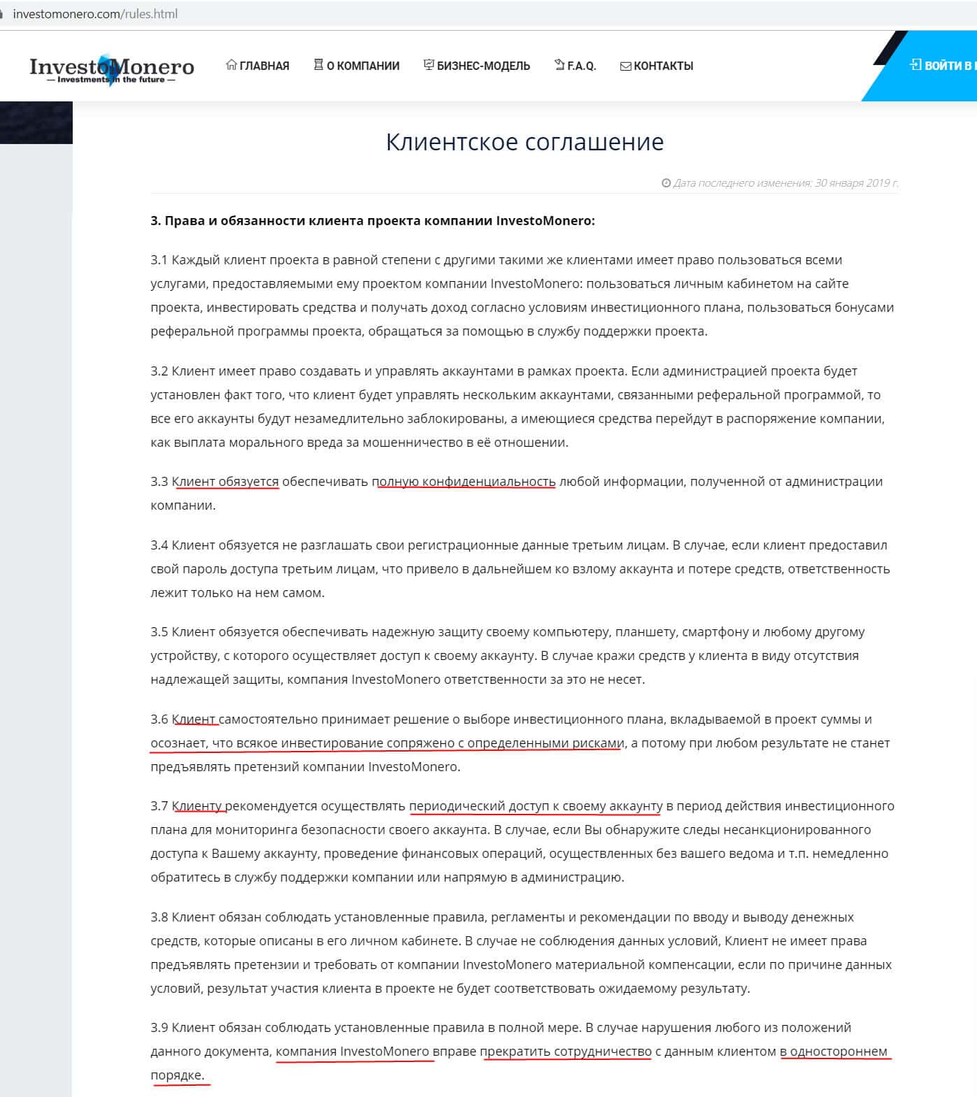 Основные положения клиентского соглашения конторы ИнвестоМонеро