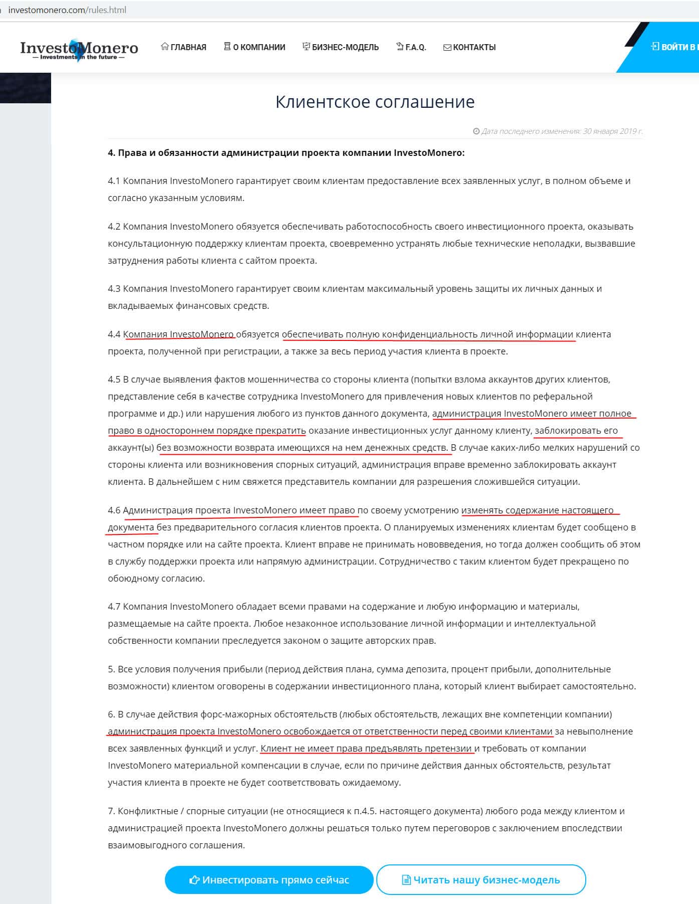 Следующий раздел посвящён правам и обязанностям администрации конторы Инвесто Монеро. Здесь они за собой оставили полную свободу действий, начиная от изменении сути договора в любой момент, без согласия клиентов, и заканчивая блокировкой доступа в личный кабинет трейдер, если им это необходимо будет.
