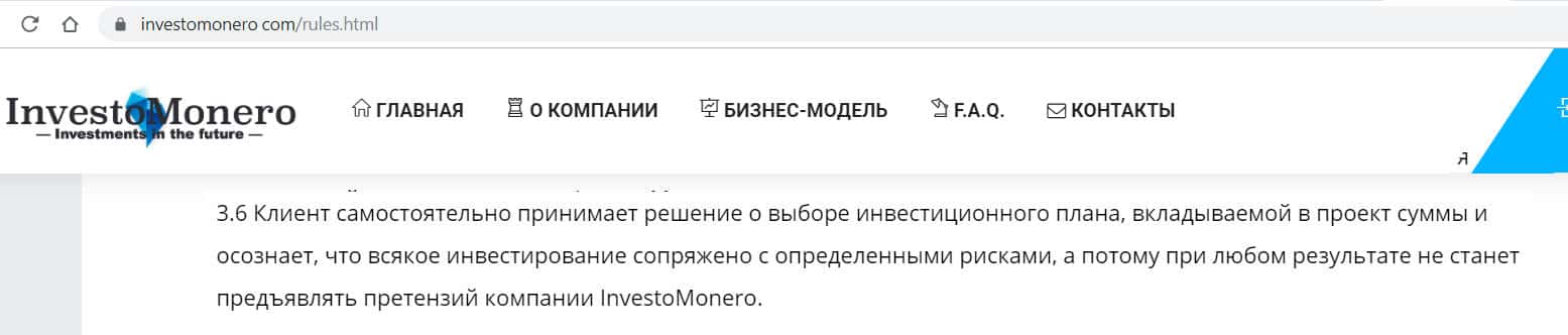 Предупреждать о рисках клиентов обязаны любые конторы, обычно они это делают очень мелким шрифтом в самом конце веб-сайта. Однако на официальной странице у мошенников InvestoMonero нет данной инфы. Все, что нам удалось найти - это три строчки в клиентском договоре, мол Вы сами знаете, что можете лишиться всех денег в любой момент.