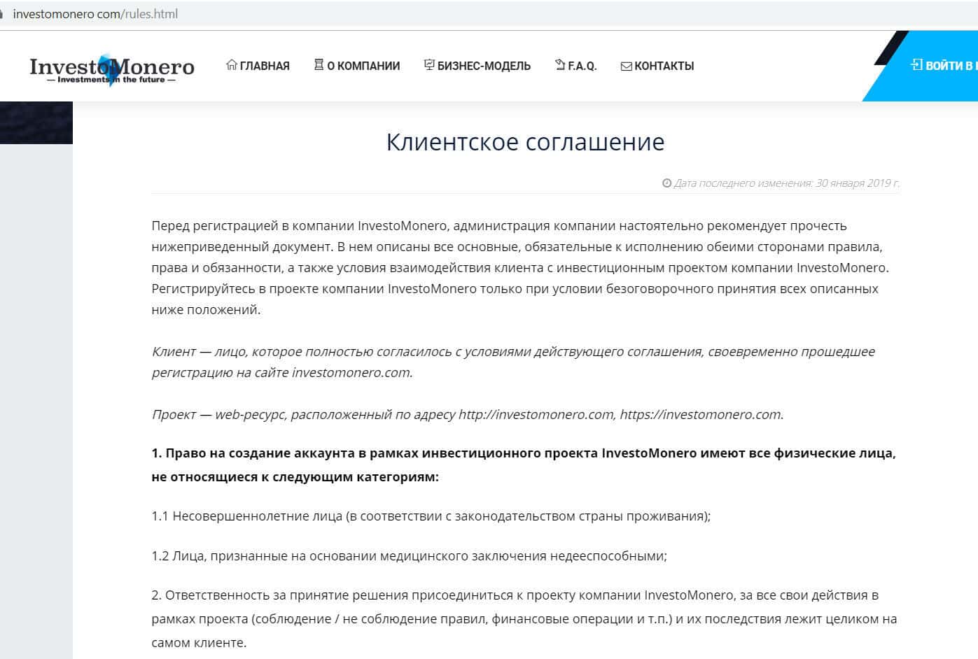 - Основные положения клиентского соглашения конторы ИнвестоМонеро