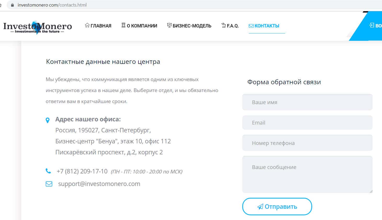 На своем официальном сайте жулики InvestoMonero разместили для связи с ними адрес, телефон и почту. Адрес указан российский, что вызывает доверие у клиентов, но к слову данная контора организована в Гонконге, а значит ничего общего с данным адресом не имеет. Ниже приводим почту и телефон для связи: