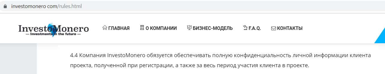- Политика конфиденциальности компании Инвесто Монеро