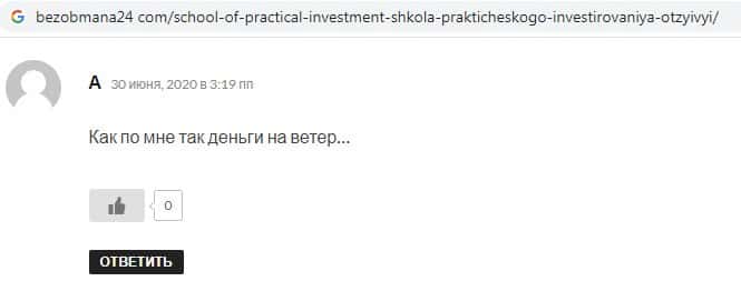 Отзыв бывшего клиента лохошколы InvestorPractic Ru такой, что если вы решитесь потратить деньги на курс Инвестор Практик, то это будут деньги просто выброшены на ветер.