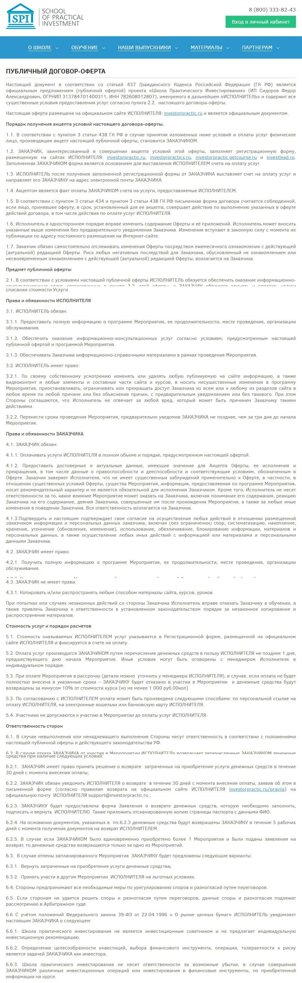 Ниже приведён полный текст договора мошенников InvestorPractic Ru со своими клиентами. Именно так будут регулируются взаимоотношения жуликов с будущими клиентами.