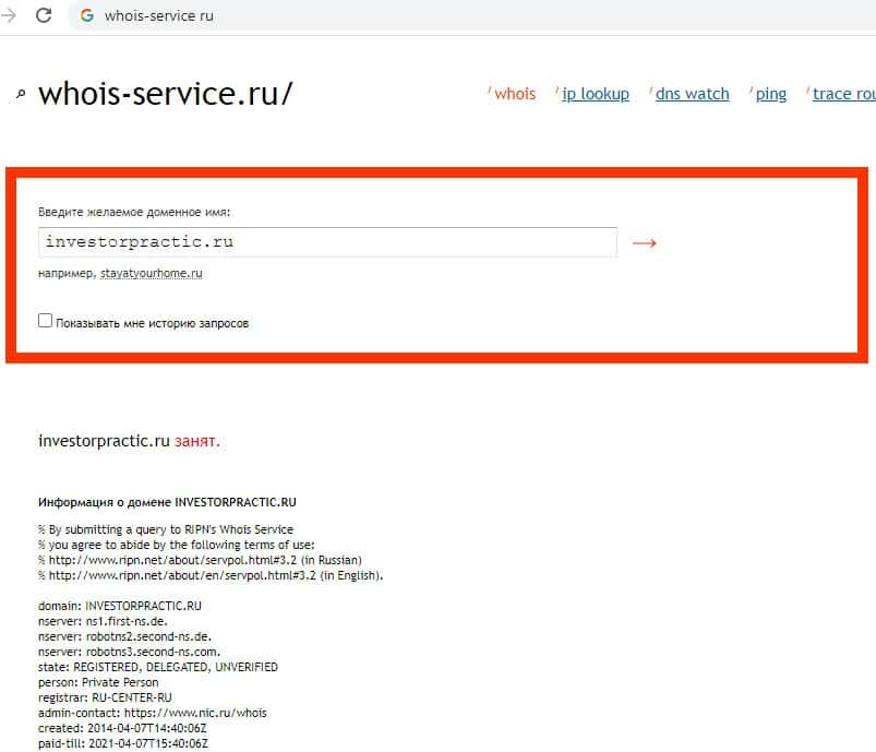 - Онлайн-проверка возраста домена шарамыжной конторы Инвестор Практик