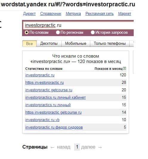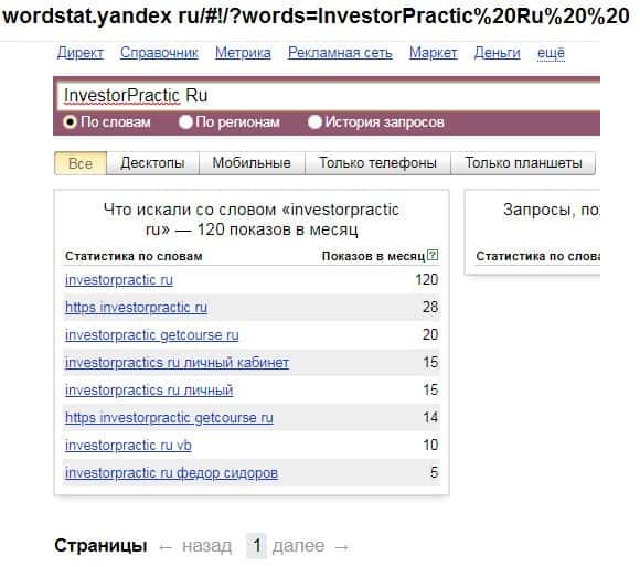 И последний запрос в яндексе на английском языке с одним пробелом "InvestorPractic Ru" выдает результат в 120 показов в месяц.