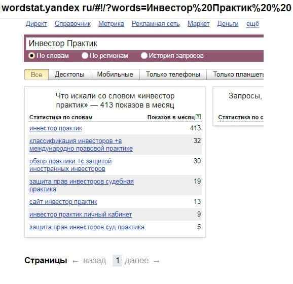 Второй запрос в яндексе на русском языке с одним пробелом "Инвестор Практик" выдает результат в 413 показов в месяц. Это существенно больше, чем в предыдущем случае.