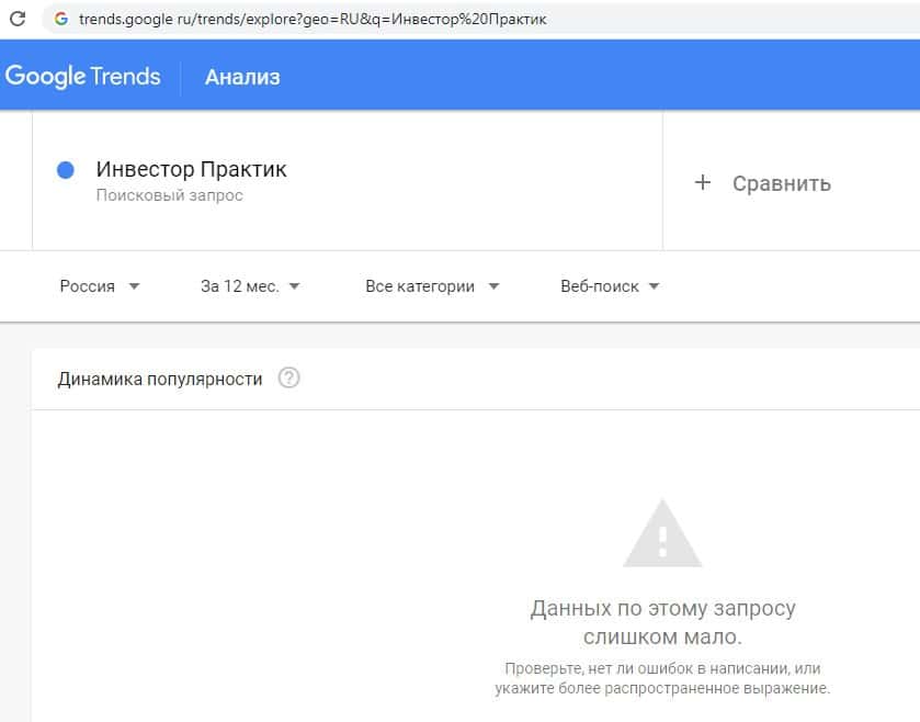 Второй запрос в Гугл на русском языке с пробелом "Инвестор Практик" выдает результат в 0 показов в месяц, как и в прошлый раз. По такому запросу информацию не ищут.