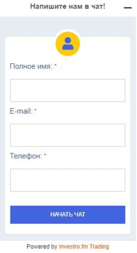 Также мошеннический брокер Инвестро предлагает клиентам воспользоваться онлайн-чатом, где уже с ходу начинают выпрашивать у клиентов их имя, электронную почту и телефон.