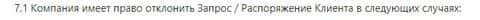 Также в соглашении кухни Investro Fm указано, что она имеет за собой право отклонить запрос клиента по различным ситуациям, при чем без указания какой-либо причины.