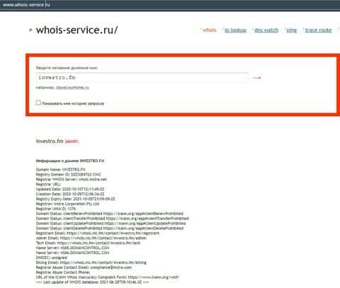 Чтобы проверить, кто является владельцем интнрнет-сайта Investro Fm мы решили обратиться на ресурс whoise-service ru. Данные скрыты из-за их шулерской деятельности.
