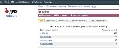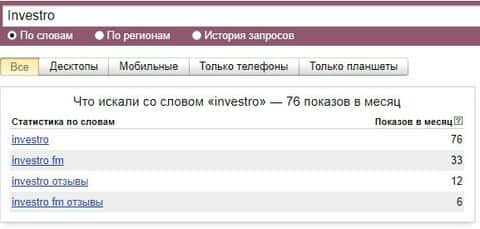 Касательно англоязычной версии бренда "Investro", здесь есть что сказать, так как они по версии Яндекс Вордстат набрали 76 показов за последний месяц.