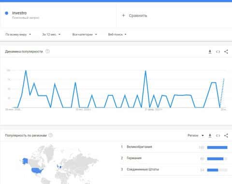 Что касается количества запросов по версии "Investro", то здесь другая ситуация. Запросы в основном идут из таких стран как: Великобритания, Германия и Соединенные Штаты Америки.
