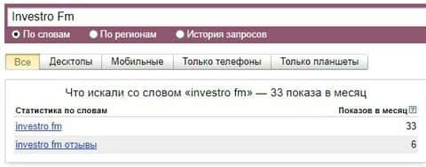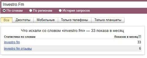 Если рассматривать поиск самого сайта "Investro Fm", только без точки в домене, то система Яндекс насчитала 33 показов за последний месяц.