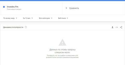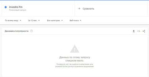 Если ввести бренд в виде официального сайта конторы без точки "Investro Fm", то поисковая система Гугл не выдает ни единого показа за последний месяц.