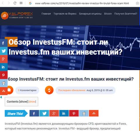 "Стоит ли Investus.fm ваших инвестиций" - задаётся вопросом автор статьи на valforex. И как ни странно, он отвечает утвердительно на свой вопрос.Вся статья пропитана ложью и издевкой о надежности и прибыльности брокера, безопасности и удобстве работы с ним, его мнимыми достоинствами, которые при более детальном рассмотрении, оказываются его слабыми местами.InvestusFM — жестокая афера с CFD и Crypto Currency