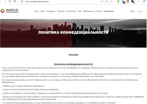 Компания мошенников заявляет о круглосуточной поддержке пользователей. Очень сомнительно, так как для связи представлены контактный телефон, представляющий собой стационарный номер в Лондоне и адрес электронной почты. Для проверки работы службы поддержки клиентов Инвестус мы отправили им письмо с просьбой о помощи, ответа на которое нам дождаться было не суждено.Политика конфиденциальности у брокера Инвестус