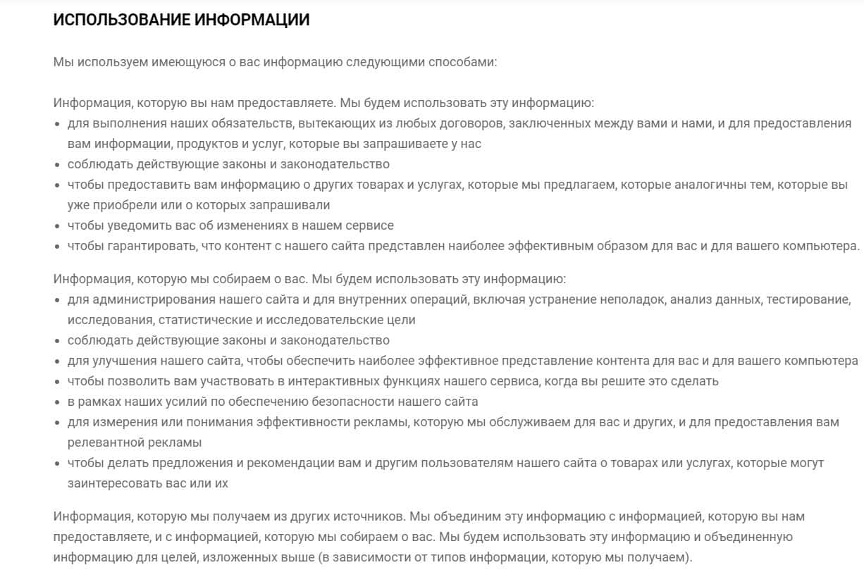 Следующий раздел договора компании Инвистус Капитал описывает, как именно создатели сайта собираются использовать данные клиентов.