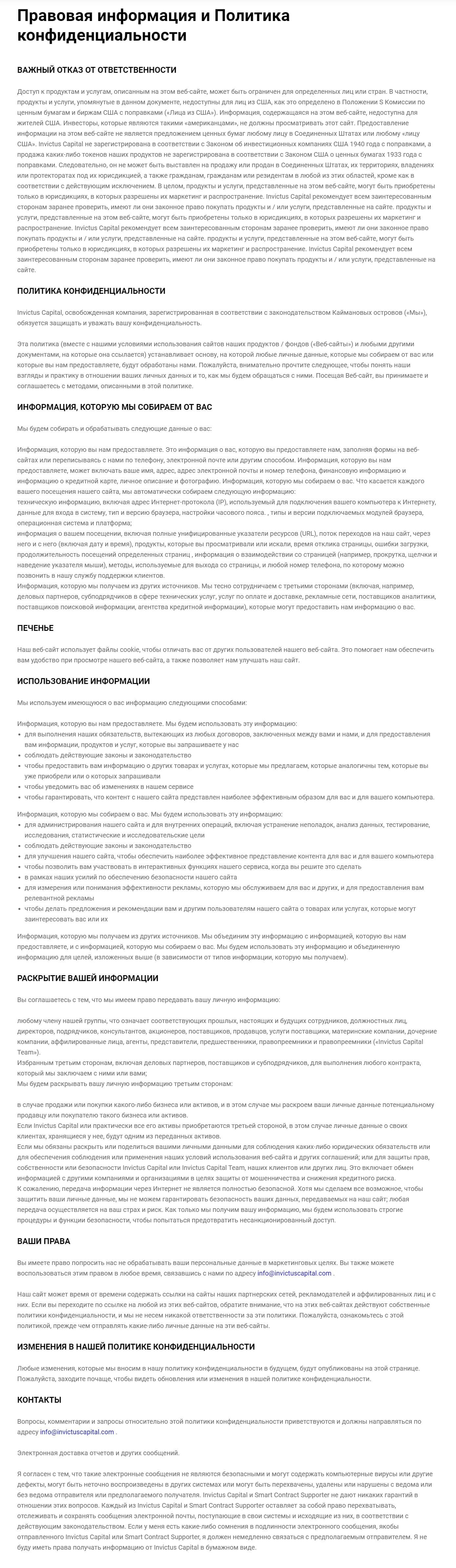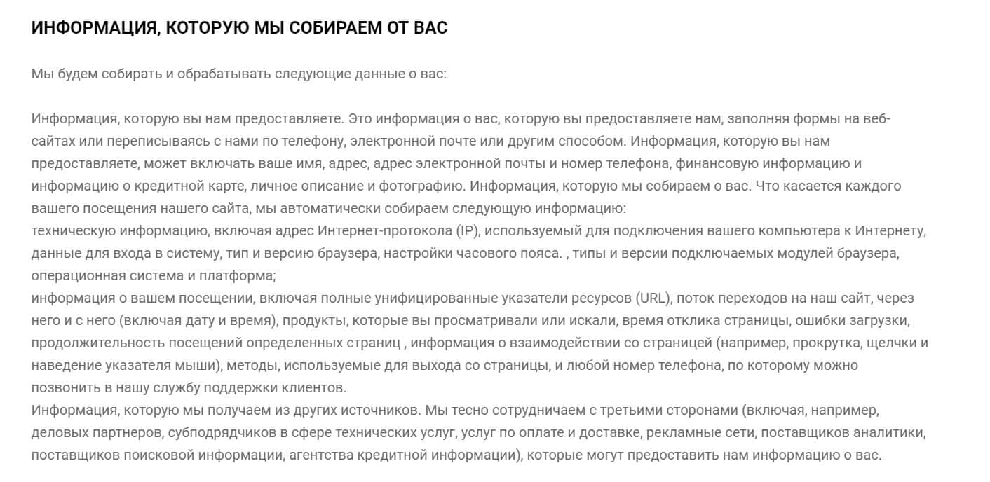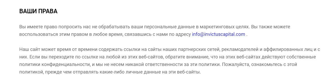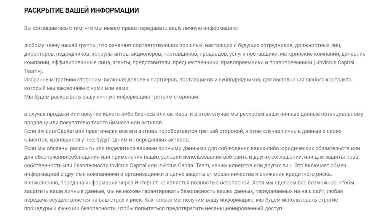 В разделе под названием Информация, которую мы собираем о вас, контора InvictusСapital описывает виды информации, получаемой с пользователя их сайта.