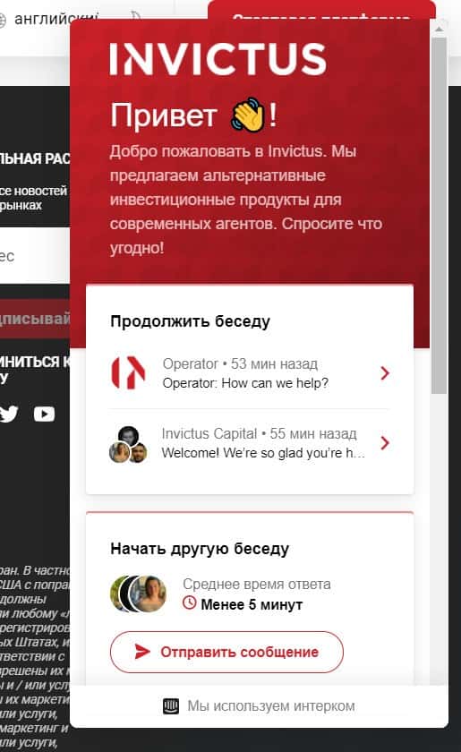 На сайте InvictusСapital можно связаться с операторам при помощи чата, окно которого можно найти внизу главной страницы.