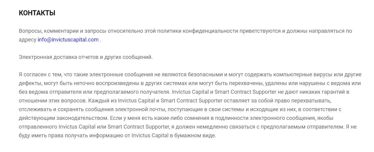 Последний раздел договора компании Инвистус Капитал называется Контакты и сообщает о том, как и в каких случаях клиент может связаться с организаторами.
