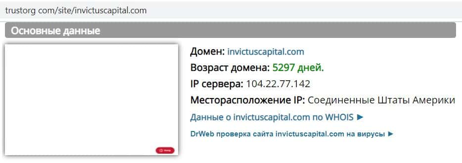 Возраст доменного имени сайта invictuscapital com составляет 5297 дней. Если верить этим данным с сайта Трасторг, криптобиржа работает уже 14 лет.