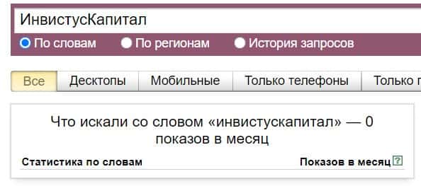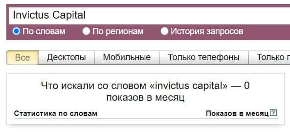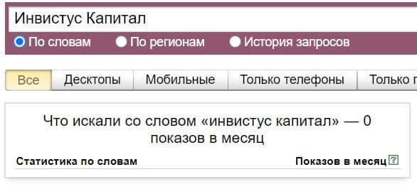 То же название, но написанное с пробелом "Инвистус Капитал", люди пытались найти в системе Яндекс с таким результатом: 0 показов в месяц.