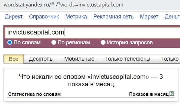 - Количество брендовых запросов в поисковике Яндекс Вордстат по InvictusСapital