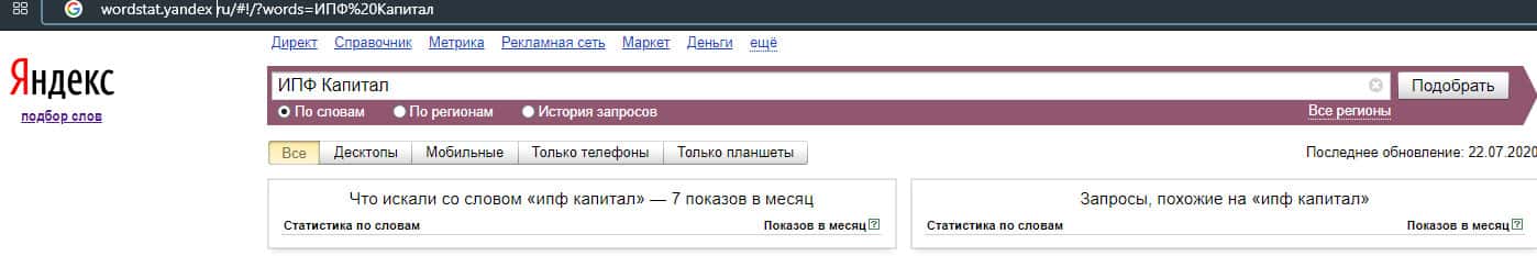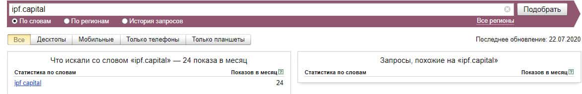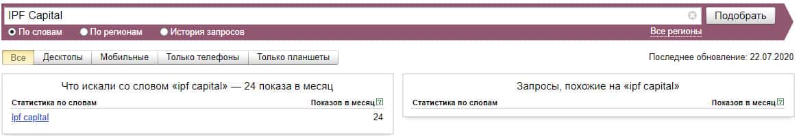 Также и ситуация и с брендом "IPF Capital", который также не менее популярен по версии Яндекс.Вордстат, птому что набрал всего-то 24 показа за месяц.