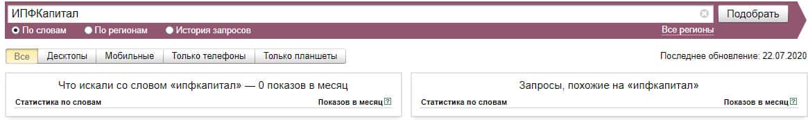 Бренд "ИПФКапитал" не популярна среди русскоязычного населения. Как раз из-за этого и количество запросов на нуле.