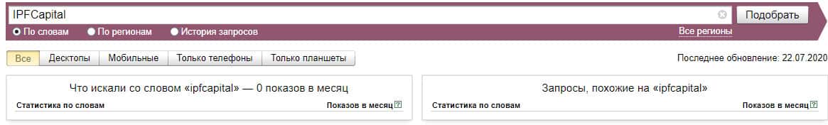 А вот англоязычное название бренда "IPFCapital" мошенники в поисковой системе Яндекс не распространили вообще, поэтому и значение показов нулевое.