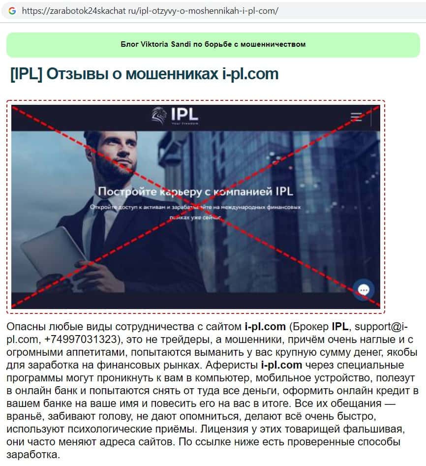 Интернет-ресурс zarabotok24skachat ru представил информацию о компании ИПЛ брокер, в которой сообщил, что сотрудничать с данной фирмой ни в коем случае нельзя, так как они аферисты.