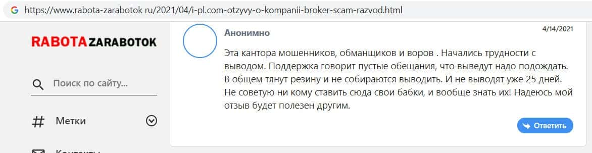 Ещё один пользователь написал отзыв, в котором сообщил, что проблемы с компанией I PL начались в тот момент, когда он поднял вопрос о выводе денежных средств.