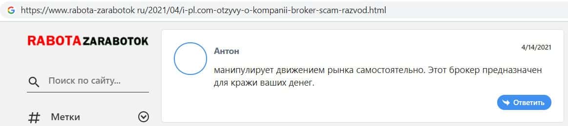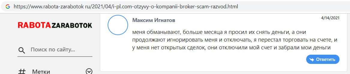 Так же онлайн-сервис rabota-zarabotok ru опубликовал статью о конторе ИПЛ брокер, в которой сообщил, что компания не выводит средства и просто разводит клиентов на деньги.