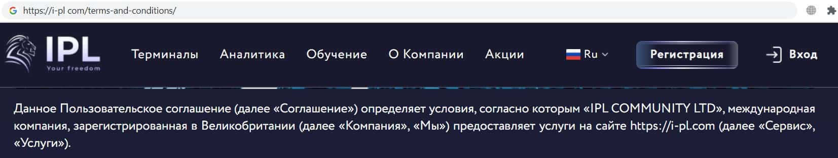 Компания финансовых разводил ИПЛ брокер представила на своём сайте информацию о юридическом лице, которым в свою очередь является компания IPL COMMUNITY LTD.