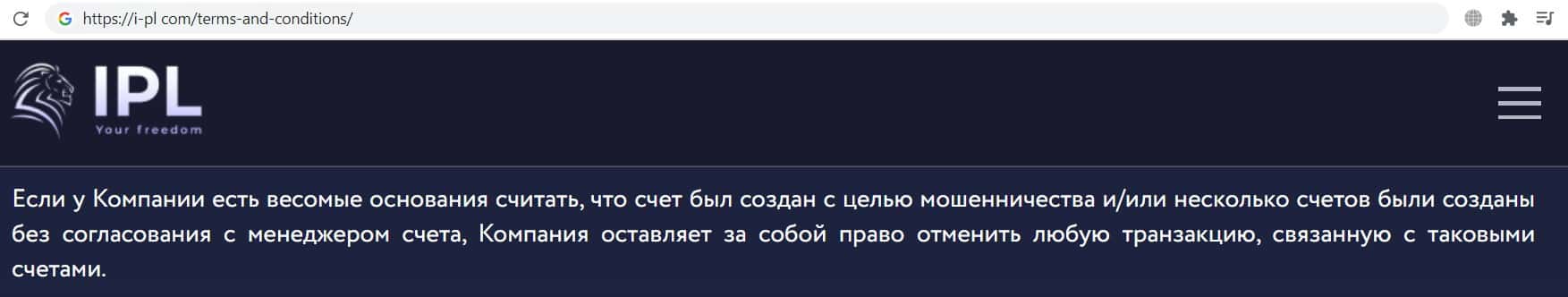 Фирма жуликов I PL указала в своём соглашении пункт, согласно которому если компания заподозрит клиента в мошенничестве, то имеет право отменить все транзакции клиентов.