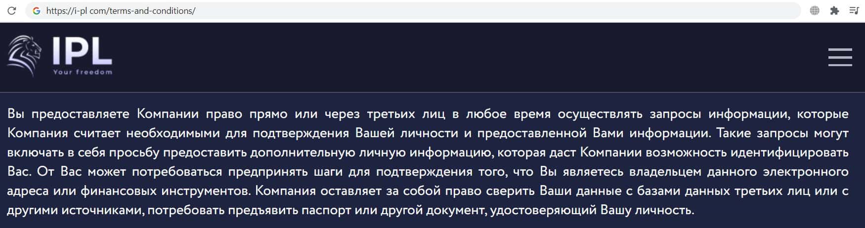 Так же контора кидал I PL указала в соглашении, что фирма и третьи лица могут запрашивать личные данные клиентов, таким образом жулики сливают данные пользователей.
