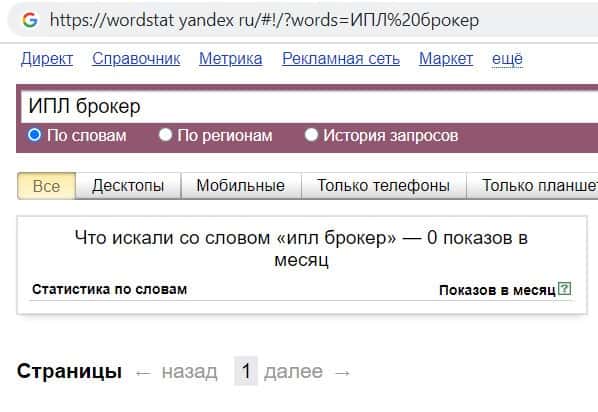 Далее мы проверили количество запросов конторы I PL по русскоязычному названию фирмы, а именно "ИПЛ брокер". Оказалось, что данный запрос пользователи не совершали.