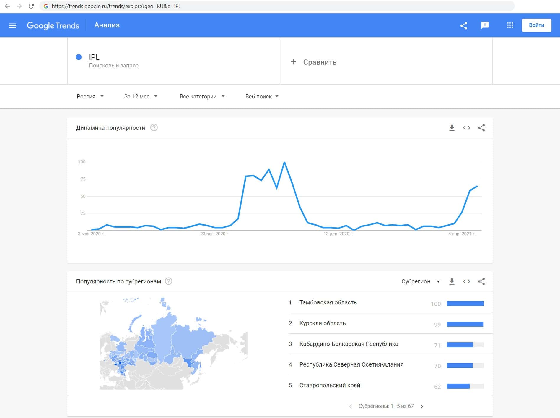 Проверили мы и количество запросов лжеброкера I PL по названию без пробела, а именно "IPL". Данный запрос совершали в основном пользователи из Тамбовской и Курской области.