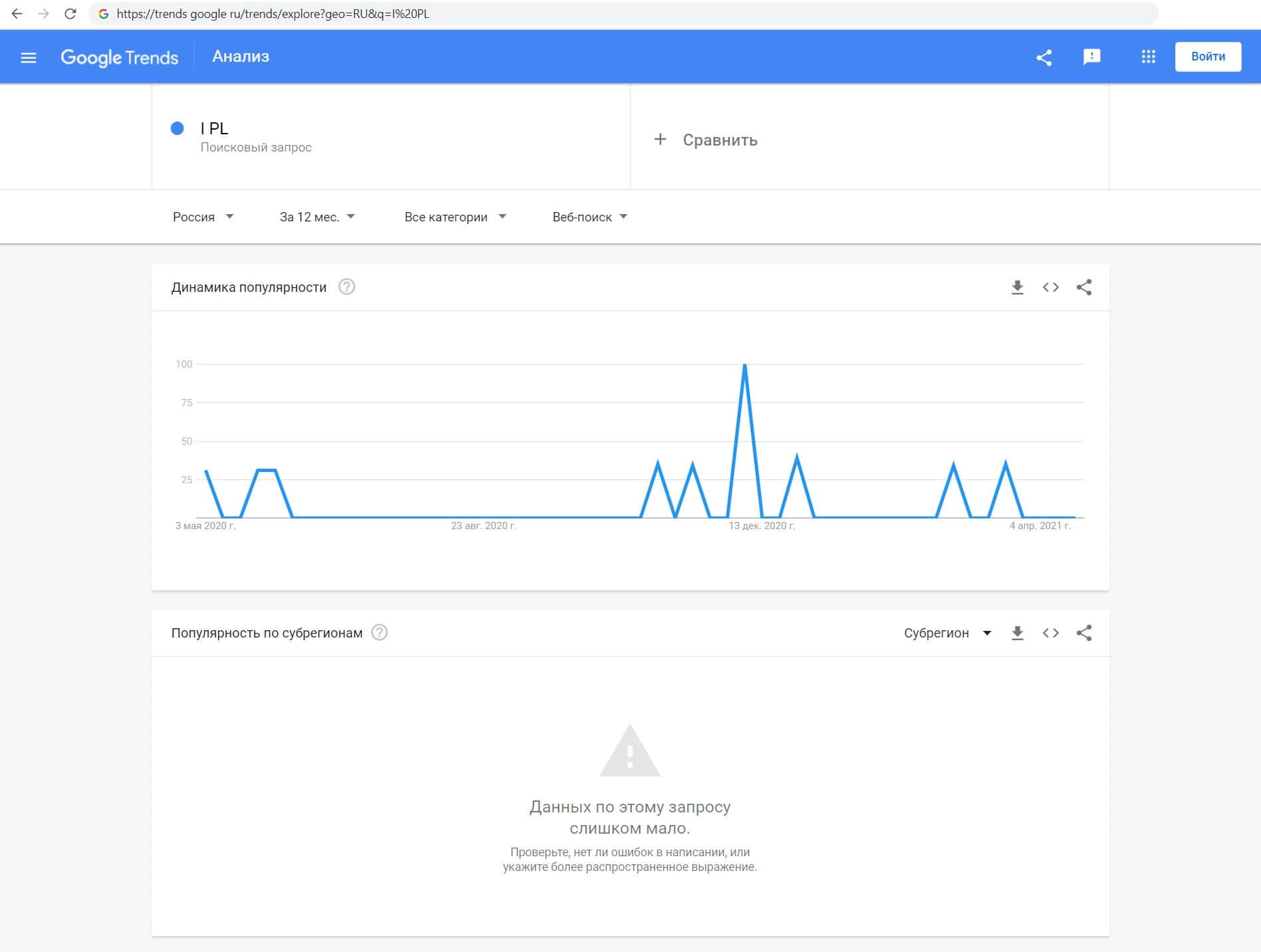 Далее мы проверили количество запросов мошеннической фирмы I PL по русскоязычному названию, а именно "ИПЛ брокер", но данный запрос пользователи не совершали.